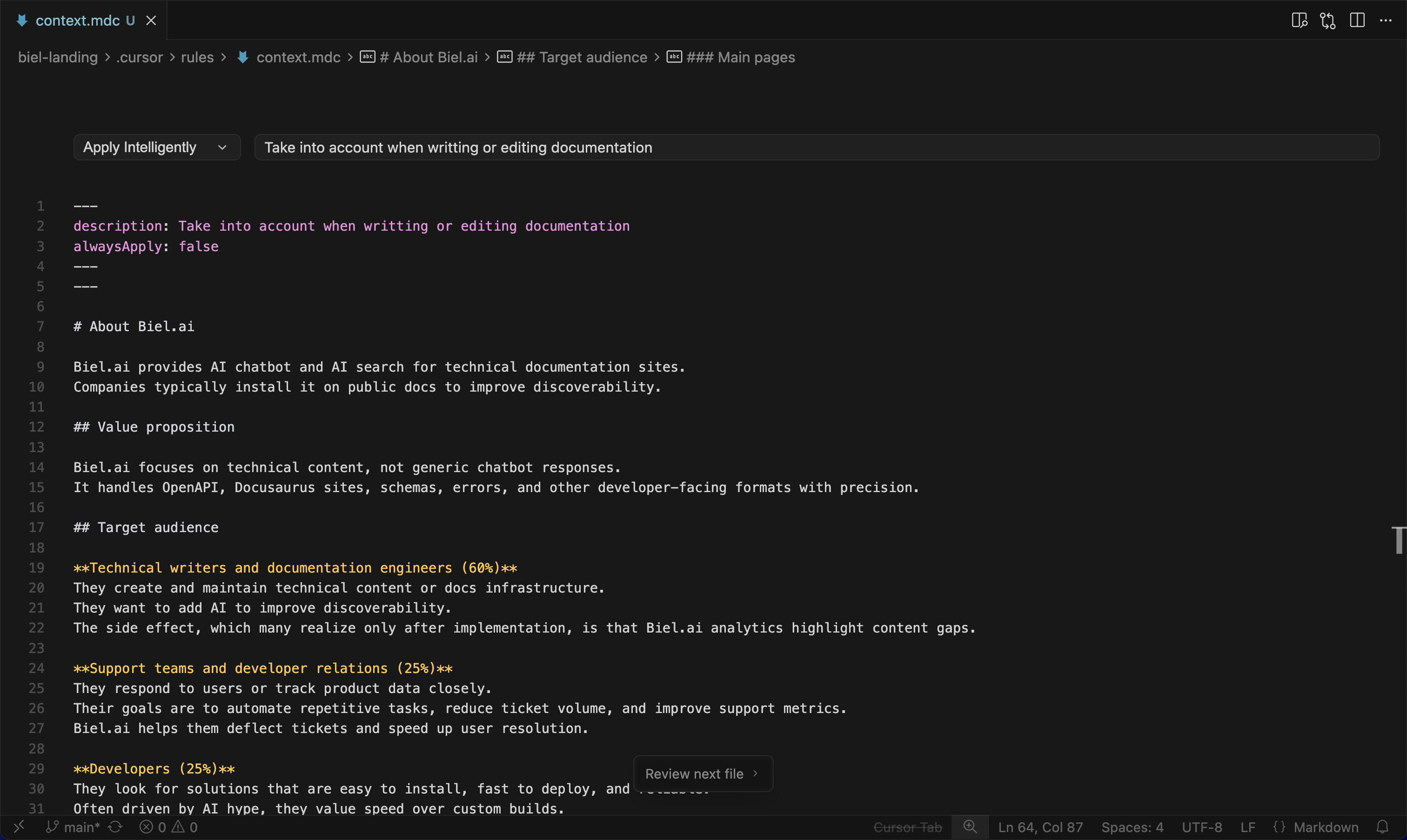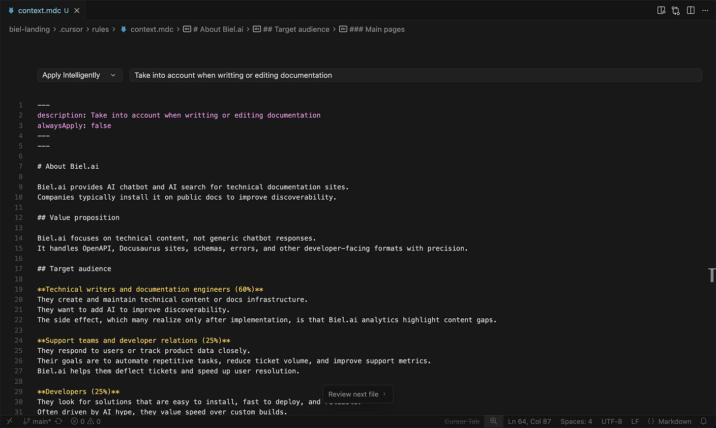 The context file aligns your team. New engineers read it to understand positioning. Writers use it for consistency. Product managers reference it when describing features.