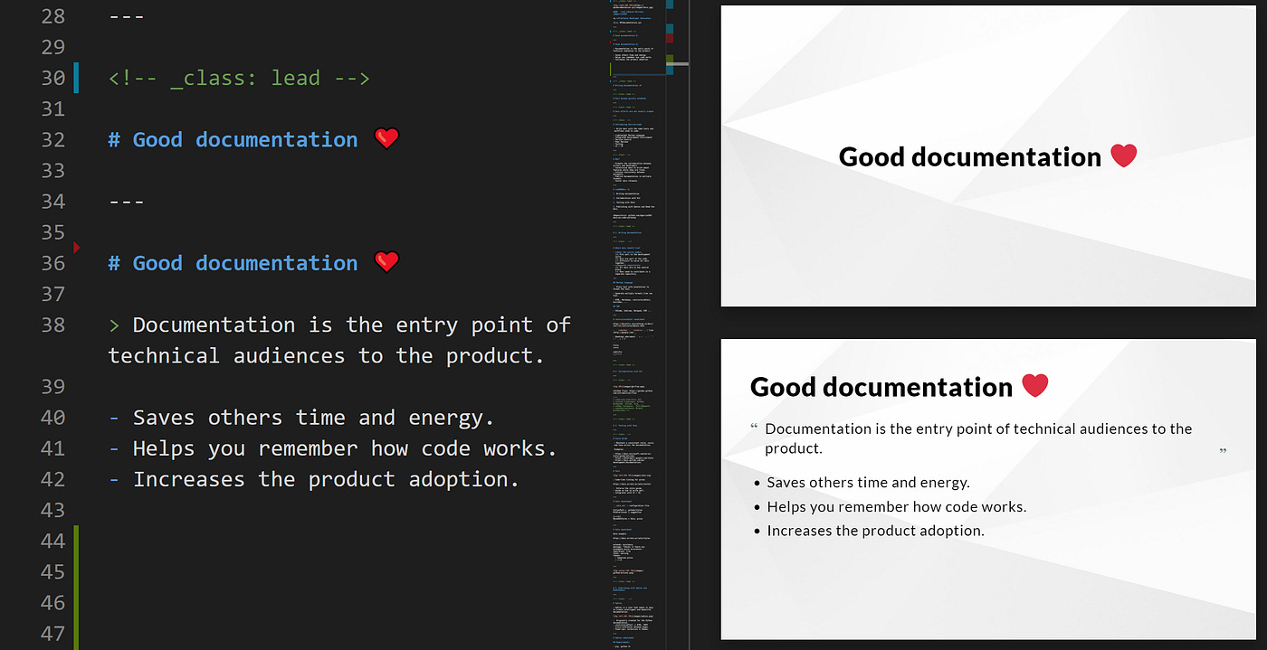 Writing slides in Markdown is faster for content. No fighting with layout tools. Version control works. Export to any format.