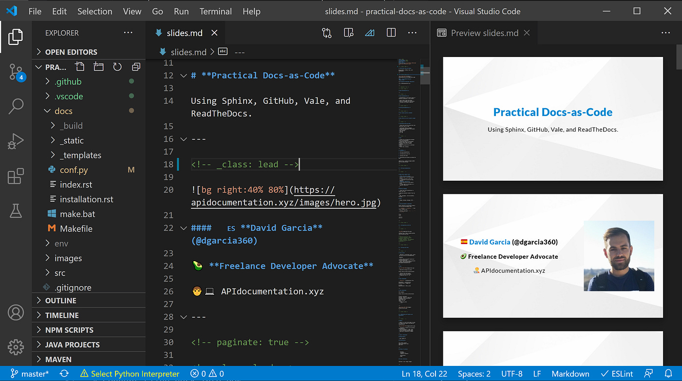 No matter which tool you use to create the presentation, the first step is to know what you want to explain. Once you have the topic, open a new file with the extension .md. Then, write your notes for your presentation in plain text using Markdown syntax.