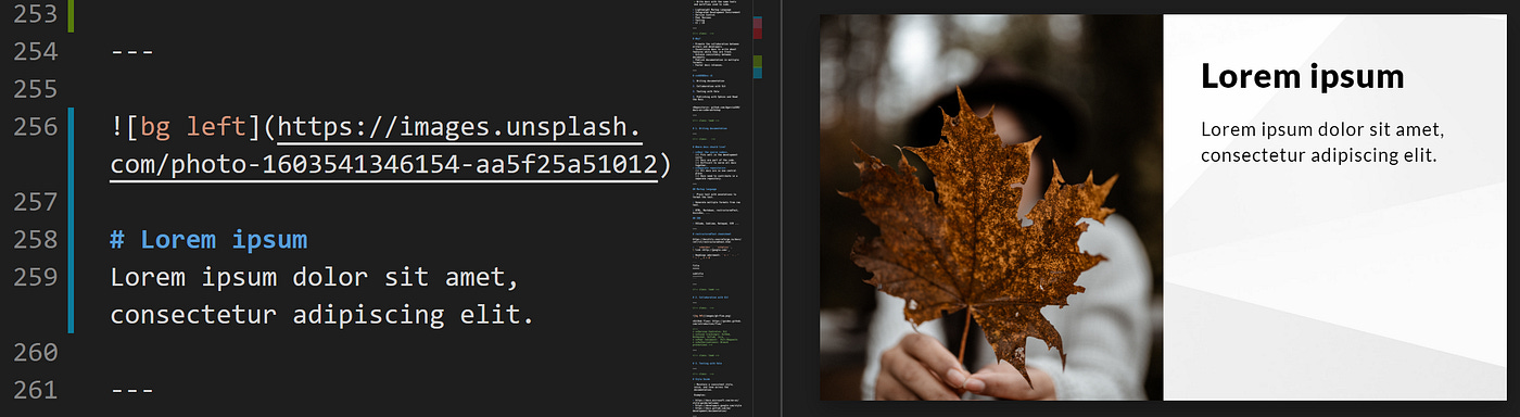 Marp also brings the option to use images as backgrounds. Backgrounds also accept the same filters as images and additional options to position them.