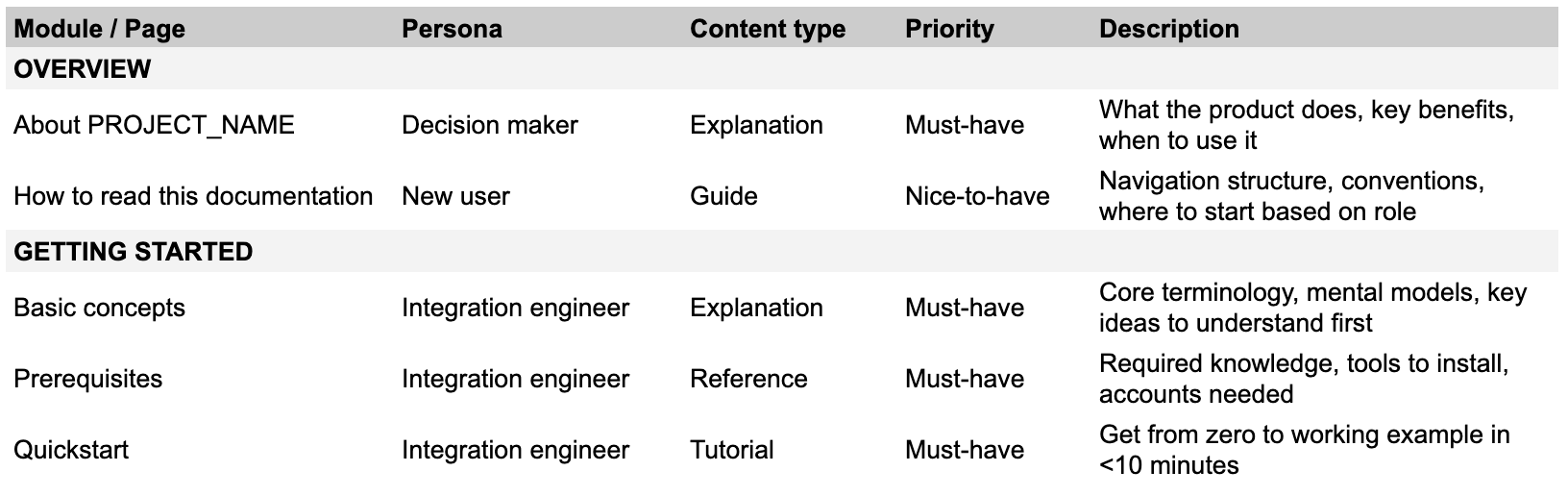 This is the difference between “we need a tutorial, someone write it” and “we need a tutorial that assumes zero prior knowledge, gets someone to a working integration in under 10 minutes, and hands them off to either the API reference or advanced tutorials depending on what they want to do next.”