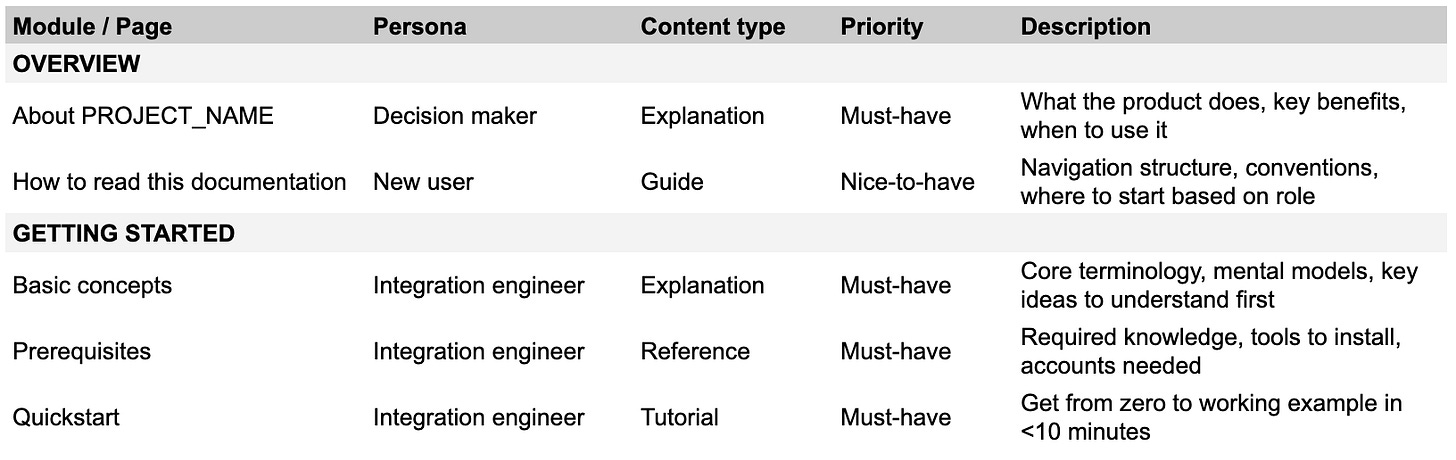 The grid forces you to think about the whole system at once instead of page by page. You’ll see gaps (”wait, we have five reference docs but no how-tos?”) and redundancies (”these three pages are basically the same thing”).